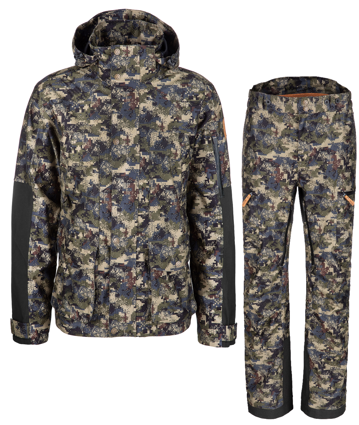Puvussa on tyylikäs digitaalikuvio jossa yhdistyy vihreä ja huomio-oranssinen väri, puku täyttää luonnollisesti hirvenmetsästyksessä vaadittavat asetukset.