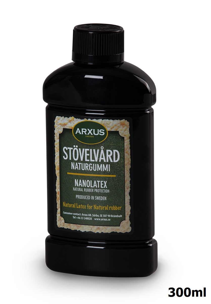 Arxus Nanolatex -hoitoaine auttaa säilyttämään kumin pinnan elastisena ja välttämään sen kuivumiselta. Nanolatex sisältää myös UV-suojan. Uusina saappaita tulee käyttää 4-5 päivää ennen hoitoaineen käyttöä. Puhdista saappaat haalealla vedellä ennen käsittelyä. Ohut kerros riittää kumin pinnalle.