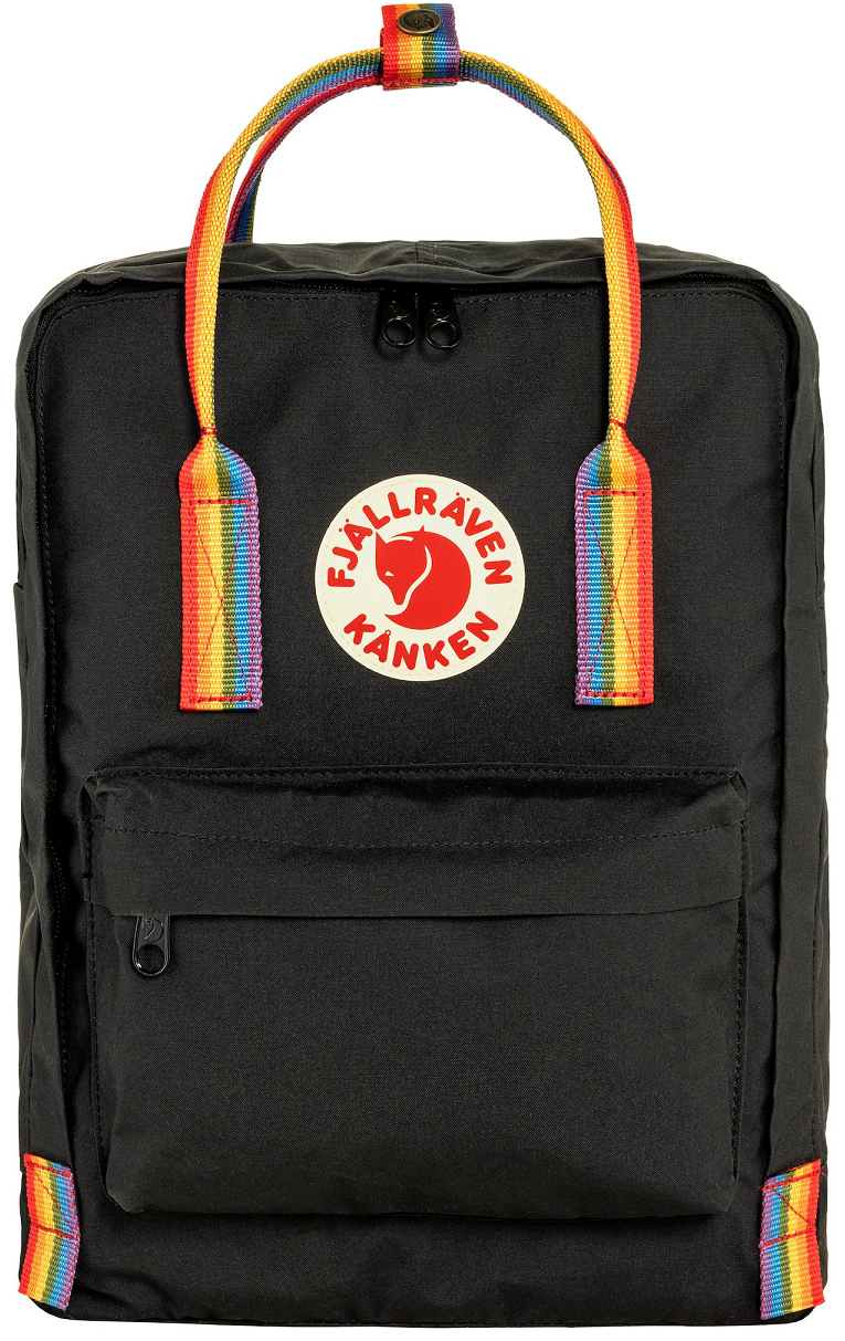 Fjällräven Kånken Rainbow-reppu, Black Kånkenin erikoisversio, jossa on sateenkaarihihnat. Osa Arctic Fox Initiative -ohjelmaa. Valmistettu kestävästä, vettähylkivästä Vinylon F... Lue lisää