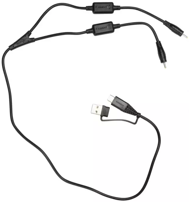 Kaapelin ulostulopäässä on 2.35 mm liittimet käsineiden akuille, ja sisäänmenopäässä sekä USB-A että USB-C -liittimet. Sopii kaikkiin USB-A- ja USB-C-latureihin. Kaapelin pituus 70 cm. Molemmissa akkujen latausjohdoissa on akun lataustilan merkkivalo.