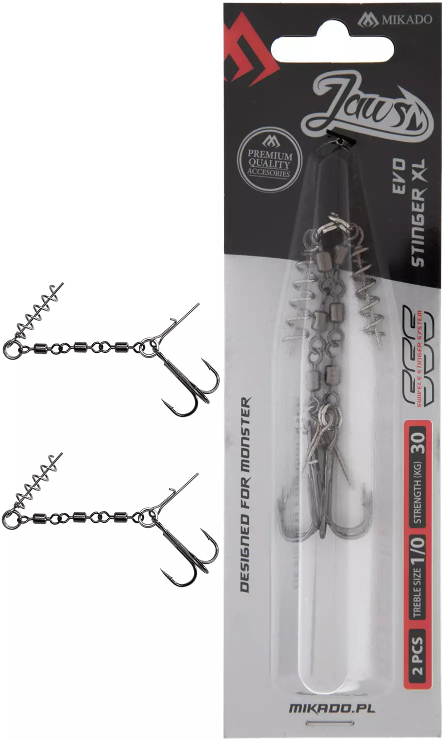 Stinger 25kg #1, Mikado Jaws Evo Stinger 2kpl Yhden kolmihaarakoukun valmis stinger. Pakkauksessa: 2kpl Koukun koko: #1