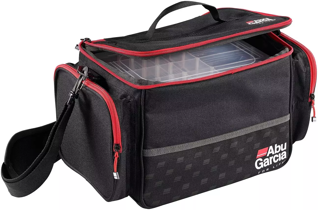 Abu Garcia- olkalaukku on keskikokoinen tarvikelaukku, joka sisältää 3 tyhjää vieherasiaa (keskikokoisia). Siinä on säädettävä olkahihna ja lisäksi kantokahva.