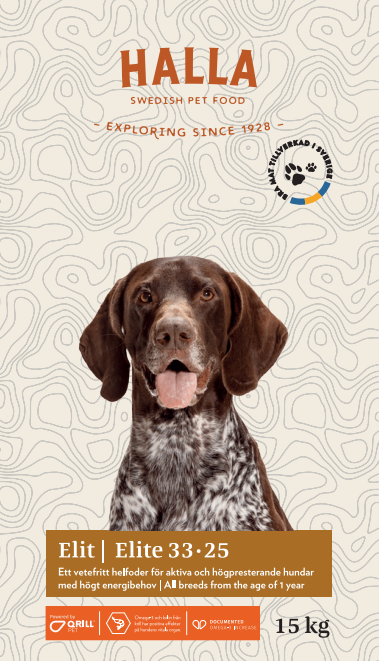 Halla Elit on tarkoitettu koirille joilla on korkea energian tarve, kuten metsästys- ja valjakkokoirille.