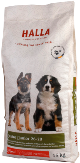 Halla Junior 26-20 (15kg) Halla Junior on vehnätön täysravinto pennuille, kasvaville nuorille koirille ja imettäville nartuille.Valmistettu ruotsalaisista ja ruotsissa tarkastetuista... Lue lisää