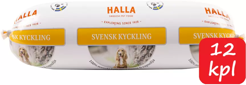 Halla Svensk Kyckling on maukas ja ravinteikas täysravinto aikuisille koirille, joilla on normaali aktiivisuustaso. Se valmistetaan Ruotsissa, ja siinä käytetään lihaa, sisäelimiä ja vihanneksia ruotsalaisilta tiloilta. Ruoka on luonnostaan hyvin sulavaa ja vatsaystävällistä.