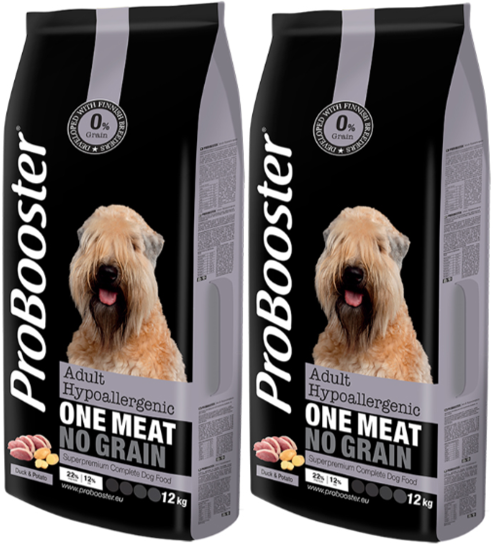 Helposti sulava ankka-peruna -pohjainen täysravinto mm. viljayliherkkyyksistä kärsiville aikuisille koirille.Viljaton ProBooster Adult Hypoallergenic on kehitetty erityisesti vastaamaan herkkien ja ruoka-aineallergioista kärsivien aikuisten koirien ravitsemustarpeita. Ravinnon valmistusaineluettelo on säilytetty yksinkertaisena herkkien tai yliherkkyyksistä kärsivien koirien tarpeet huomioiden. Ainoana eläinvalkuaisena on maukas, hypoallergeeninen ankka. Hiilihydraatin lähteenä on käytetty perunaa, joka on gluteeniton, helposti sulava ja siten soveltuva monille viljayliherkkyyksistä kärsiville koirille.