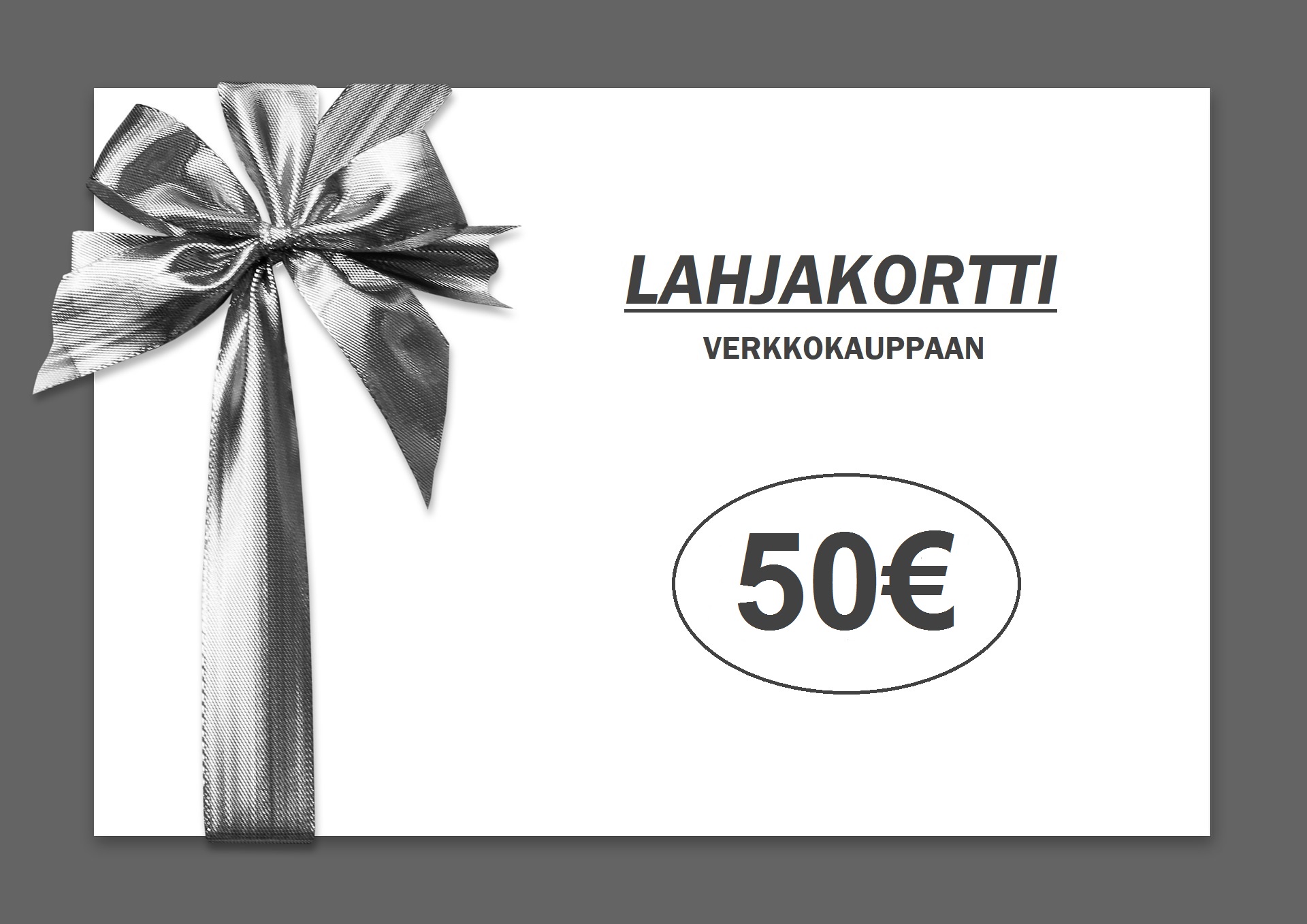 Verkkokaupan lahjakortti, verkkokauppa tilauksiin. Lähetämme sähköpostiisi koodin, joka käy verkkokaupassamme. Koodi kirjoitetaan KAMPPANJA- TAI ALENNUSKOODI kenttään. Alennus on kertakäyttöinen ja jos lahjakortin koko summa ei täyty tilauksella, jäljellä olevaa summaa ei hyvitetä jälkikäteen. Lahjakortti on 12kk voimassa ostopäivästä Huom! Tämä ei ole fyysinen lahjakortti, joten toimitustavaksi valitse nouto myymälästä. Lähetämme tilaamasi koodin välittömästi tilauksen saatuamme liikkeen aukiolo aikana (klo9:00-17:00)