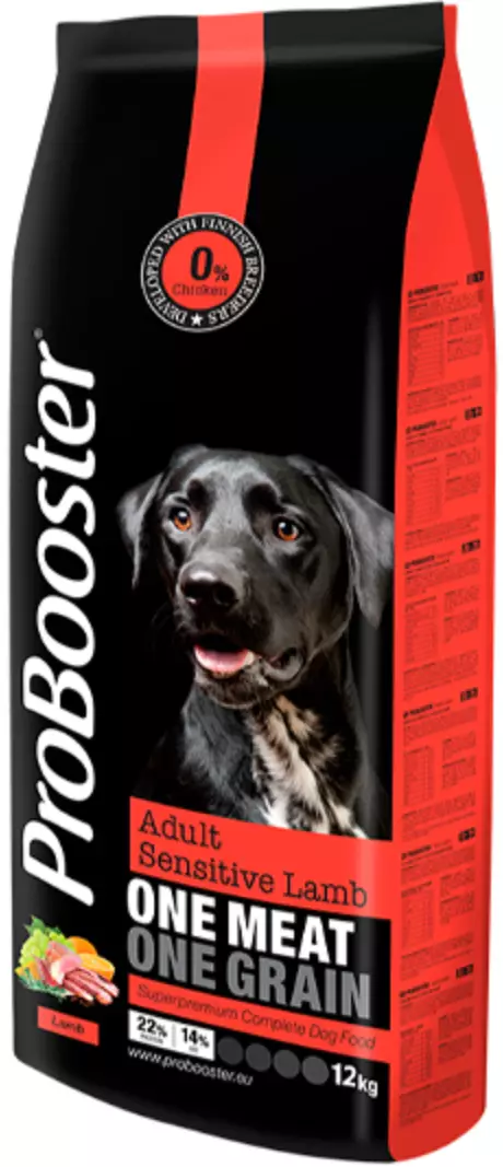 Pro Booster Adult Sensitive Lamb 12kg TÄYSRAVINTO AIKUISILLE HERKILLE KOIRILLE ProBooster Lamb on kehitetty erityisesti vastaamaan herkkien ja ruoka-aineallergioista kärsivien koirien... Lue lisää