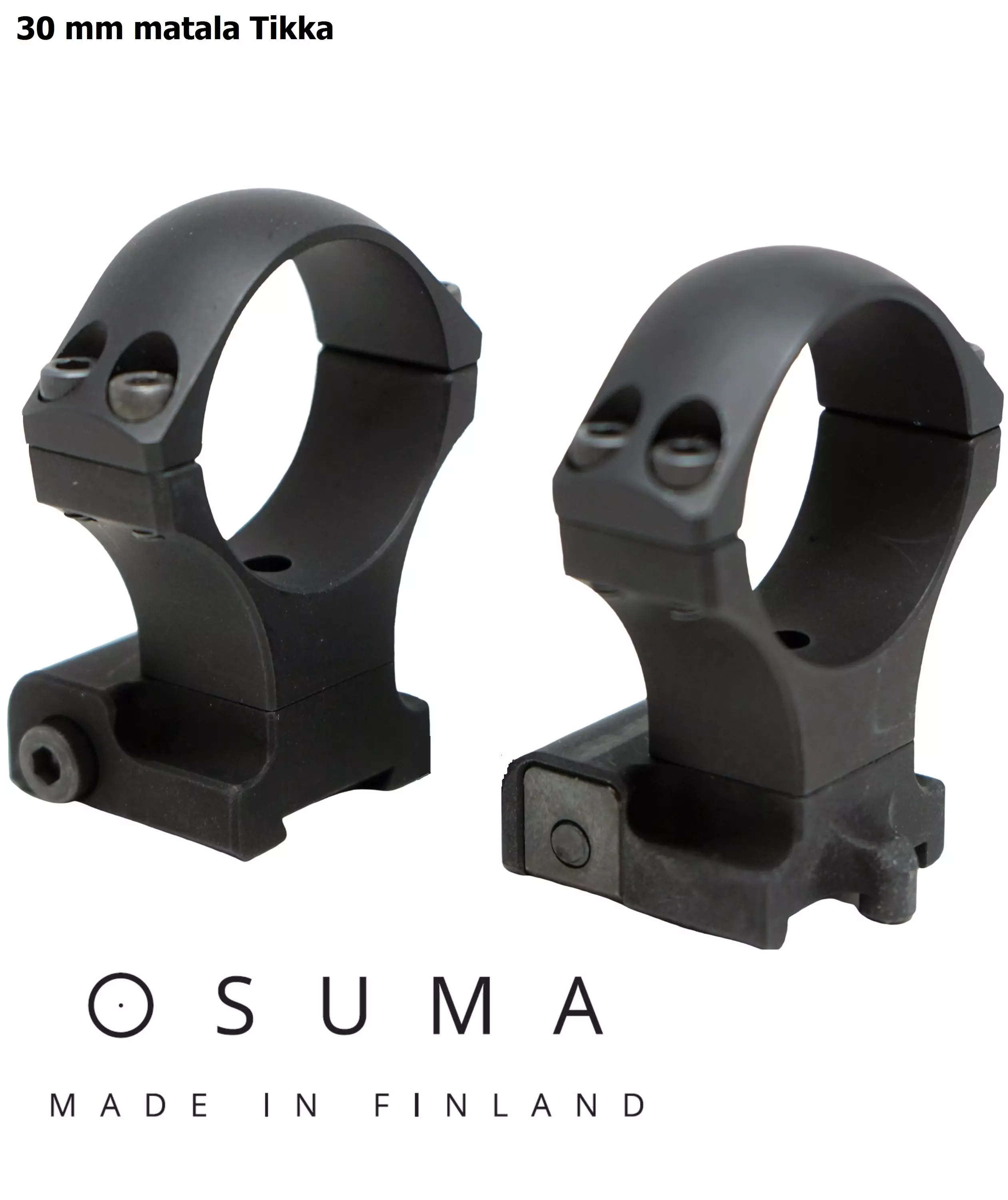 Pakkauksessa on kaksi Tikka kivääreiden kiskoon yhteensopivaa jalustaa sekä renkaat, joilla saat asennettua 30mm runkoputkella varustetun kiikarin kivääriisi.