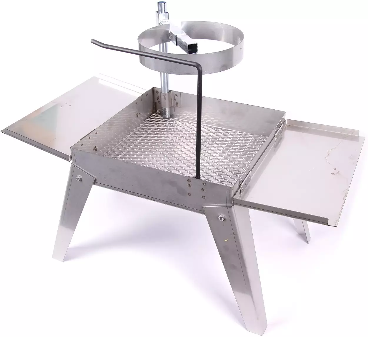 Telineen pohjarakenne ja verkkoritilä muodostavat tehokkaan arinan, joka parantaa ilman virtausta ja takaa tasaisen palamisen. Setti sisältää kaiken tarvittavan ruoanlaittoon nuotiolla – paistinpannun, säädettävän telineen sekä kahvipannukoukun.