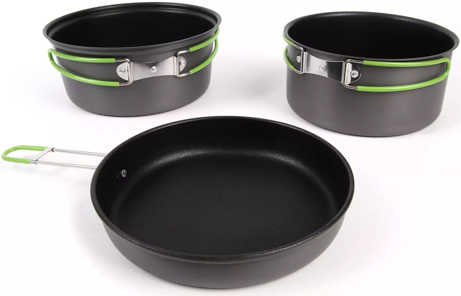 Sarja sisältää kaksi erikokoista kattilaa sekä paistinpannun, jota voi käyttää myös kantena. Kaikki osat pakkautuvat sisäkkäin pieneen tilaan, joten setti kulkee helposti mukana repussa.