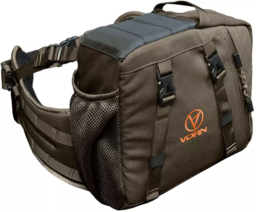 Vorn SR10 on innovatiivinen ja patentoitu lantiolaukku, jossa on sisäänrakennettu ampuma-alusta. Se tukee kyynärpäätäsi ja vähentää tehokkaasti tähtäimen liikettä, jolloin voit ampua seisten vakaammin – jopa kaksinkertaistaa varman laukaisuetäisyyden.